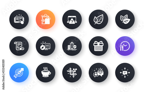Minimal set of Online question, Target and Web system flat icons for web development. Chemistry dna, Medical prescription, Idea icons. Apartment insurance, Technical documentation. Vector
