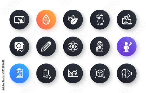 Minimal set of People vaccination, Stress and Pencil flat icons for web development. Seo devices, Recovery data, Augmented reality icons. Checklist, Atom core, Touch screen web elements. Vector