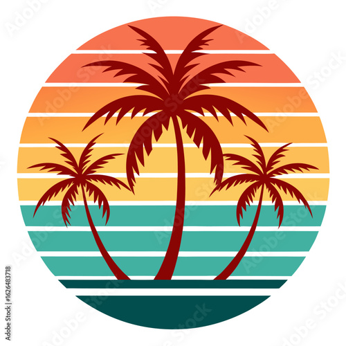 palm, tree, beach, tropical, summer, vector, island, sea, sun, illustration, silhouette, nature, travel, landscape, ocean, sunset, sky, coconut, vacation, palm tree, water, holiday, paradise, design, leaf