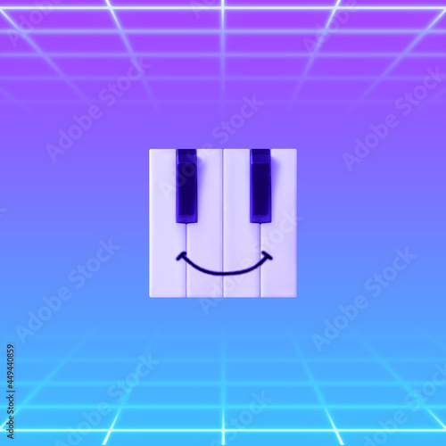 Minimal vaporwave or cyberpunk abstract music scene with creative emoticon made of piano keys on vibrant, purple and blue gradient background with perspective grid. Happy face emoji 3D illustration.