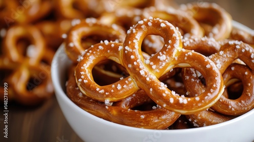 minimal yet striking view of salted pretzels in a smooth white bowl, their curves and salt grains accentuated