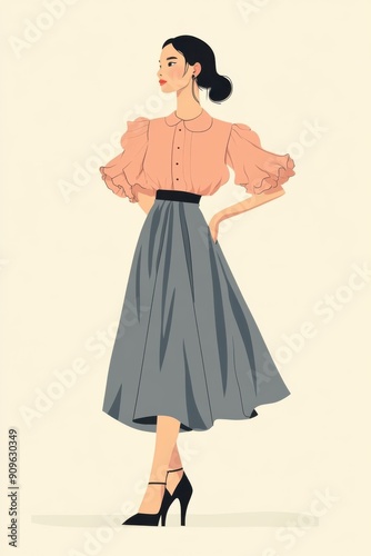 Minimalism illustration, an Asian woman, wearing a pink ruffled blouse with a gray high-waisted skirt and black ballet flats, with one hand on her hip, chic fashion, boho, flat illustration