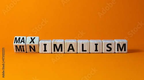Minimalism or maximalism symbol. Turned wooden cubes and changed the word minimalism to maximalism. Beautiful orange background. Business, minimalism or maximalism concept. Copy space.