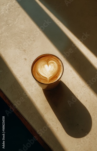 Minimalist Aerial View of Coffee Cup with Heart Latte Art in Sunlight
