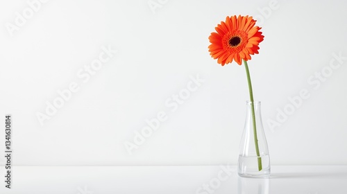 Minimalist Aesthetics: A Single Vibrant Orange Gerbera Daisy in a Clear Glass Vase Against a White Backdrop - A Harmony of Simplicity and Elegance