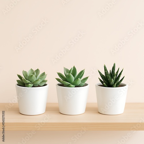 Minimalist arrangement of three green succulent plants in white ceramic pots on wooden shelf, modern home decor, indoor gardening, and stylish plant lover inspiration