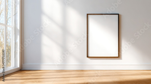 Minimalist art display in bright room featuring empty frame modern interior natural light