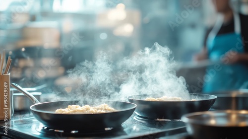 Minimalist background template for noodle product design, highlighting empty packaging objects like fast food boxes, dessert bags, and porridge cups in a clean, white space.