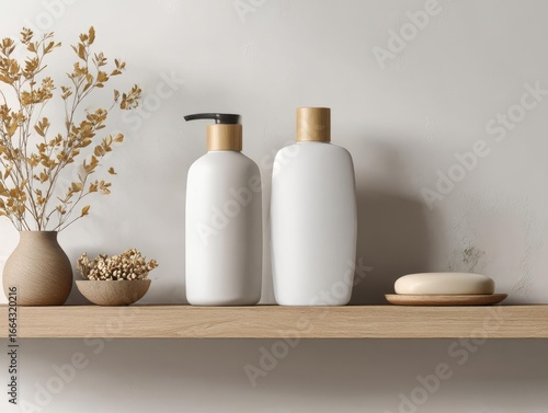 minimalist, bathroom, accessory, display, shelf, soap, shampoo, elegance, contemporary, vase, bowl, dried flowers, serene, aesthetic, interior design, home, modern, chic, decor, organisation, lifestyle, beauty, hygiene, scandinavian, spa, calmness, simplicity, tidy, light, wood, arrangement, calming