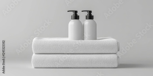 Minimalist bathroom decor with two white towels and lotion bottles