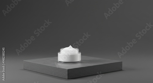Minimalist beauty cream jar on a sleek gray surface with soft lighting