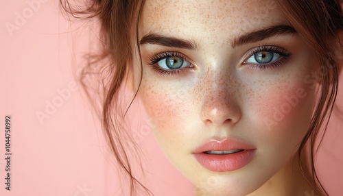 Minimalist beauty portrait of a woman, soft pink background, delicate and elegant