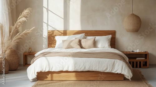 bed, bedchamber, interior, design, minimalism, modern, decor, home, style, furniture, bedding, pillow, blanket, bedside, table, nightstand, lamp, light, shade, natural, wood, wooden, cosy, comfortable, relaxing, warm, neutral, colours, earth, tone, simple, elegant, stylish, contemporary, chic, white, brown, beige, room, hotel, luxury, pillow, apartment, headboard, house, sleep, decoration, sheet, mattress