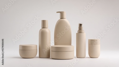 Minimalist beige cosmetic containers including jars, bottles, and pump bottles arranged neatly on a plain surface with soft lighting.