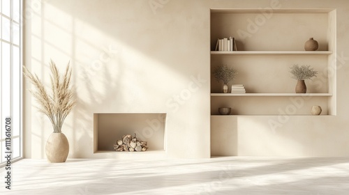 beige, room, minimalist, decor, shelf, built, in, shelving, neutral, calm, serene, peaceful, tranquil, quiet, simple, clean, modern, contemporary, style, design, interior, home, apartment, house, living, space, sunlight, shadow, window, light, vase, flower, dried, pampas, grass, book, bowl, wood, fire, fireplace, mantle, earthenware, pottery, aesthetic, ambience, cosy, comfortable, warm