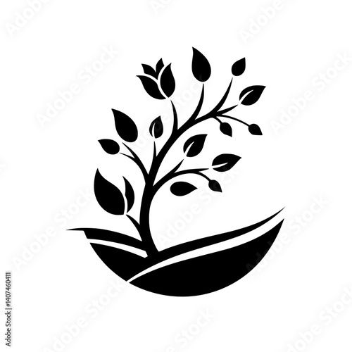 vector, tree, silhouette, black-and-white, minimalist, nature, leaf, branch, environmentally friendly, growth, environment, ecology, logotype, symbol, design element, graphic, illustration, gardening, organic, sustainable, planting, spring, blossom, germinating, abstract