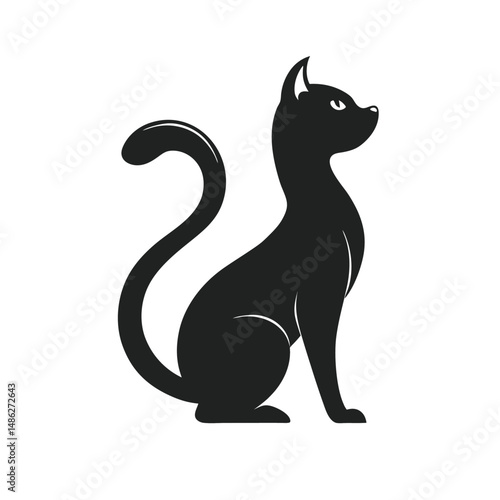 Minimalist Black Cat Sitting Profile View with Curled Tail on Isolated White