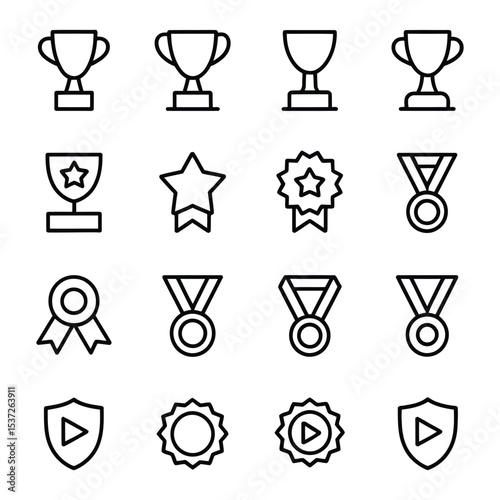 Minimalist black outline icon set of awards and achievements in 4x4 grid layout on white background