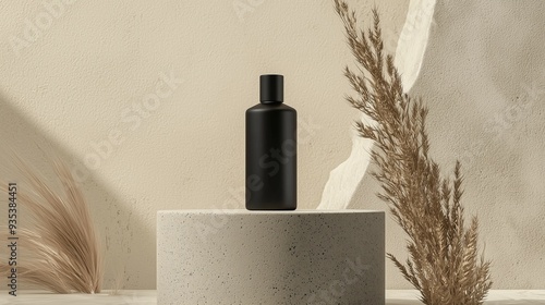 Minimalist black perfume bottle on a concrete pedestal with dried grasses, symbolizing natural elegance and simplicity.