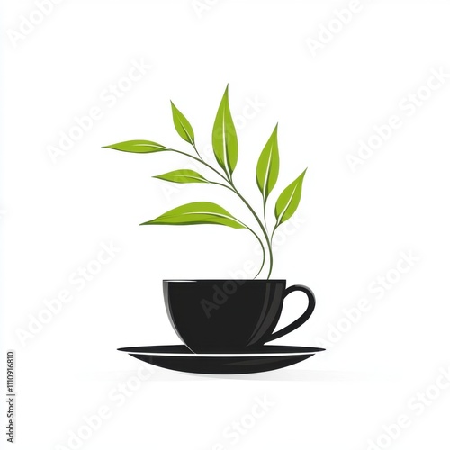 Minimalist Black Tea Cup with Green Plant Silhouette on White Background