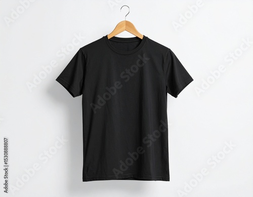Minimalist black t-shirt mockup (no logo), perfectly centered on a hanger, soft light, isolated on white/light gray. High detail, realistic fabric for advertising & product design