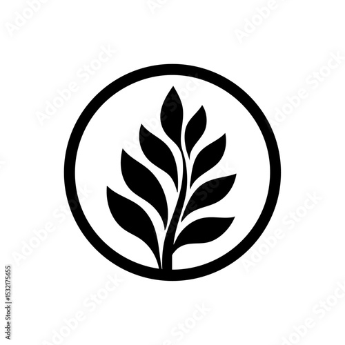 Minimalist black vector icon of a stylized leaf inside a circular frame.