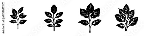 Minimalist black-and-white vector illustration depicting various simple silhouettes of plant leaves in a clean design