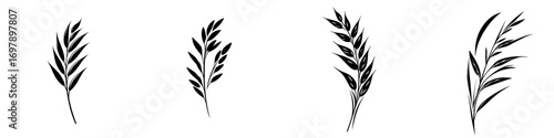 Minimalist black-and-white vector illustration of plant silhouettes showcasing diverse leaf shapes and arrangements in a simple design