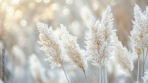 Minimalist bokeh effect highlighting delicate white grasses in soft sunlight during early morning hours
