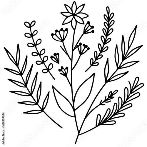 Minimalist botanical elements in elegant line art — leaves, branches, and wildflowers — black ink vector strokes, natural flow, hand-drawn look, isolated on white background1