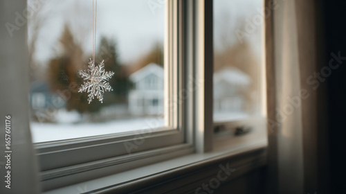 minimalist christmas celebration ambiance in cozy us interior highlighted by delicate snowflake on window