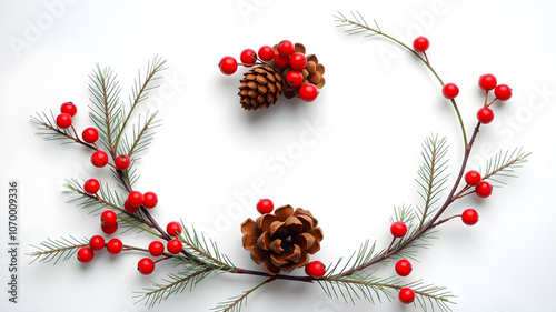 Minimalist Christmas wreath with pinecones and red berries, on white background. Generative AI