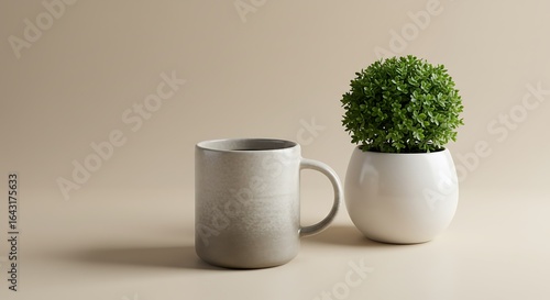 Minimalist Composition with a Ceramic Mug and a Potted Plant on a Neutral Background