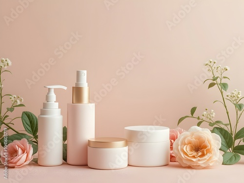 Minimalist cosmetic packaging mockup for skincare products, beauty cream and lotion bottles, cosmetic containers for skincare, beauty branding, cosmetic bottle set
