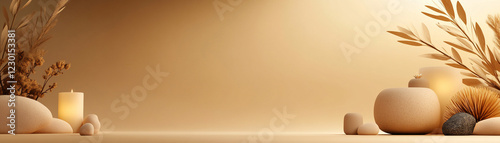 Minimalist decor with candles and stones on beige background, serene and calming ambiance.