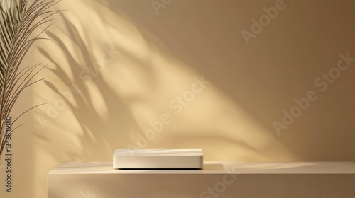 Minimalist design of a white box on a simple surface with soft shadows and a plant in the background