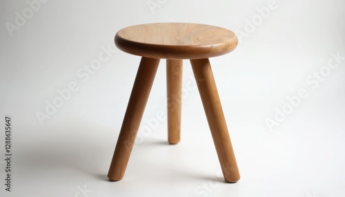 Minimalist design stool made of light solid wood. Three-legged construction simplicity, craftsmanship, functionality. Elegant wooden texture adds natural touch. Compact, stable furniture piece suits