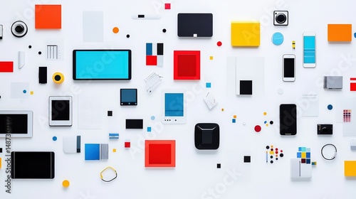 device, minimalist, geometric, shape, background, layout, modern, creative, digital, technology, flat, design, style, simple, composition, item, scattered, collection, object, smart, arrangement, art, top, view, abstract, blank, isolated, presentation, display, concept, element, nobody, communication, equipment, innovation