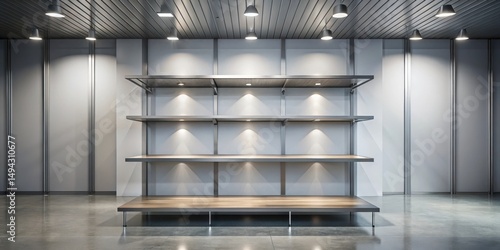 Minimalist empty room with a sleek platform and industrial-style shelving for product display, clean space, product showcase