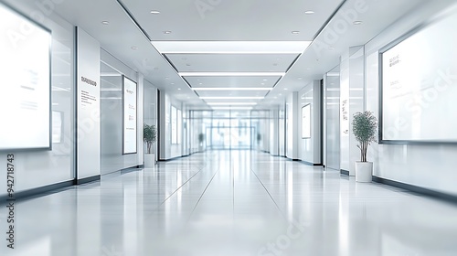 Minimalist Exhibition Hall with Blurred Signage, Sleek Flooring, and Clean Lines, Ready for Event Launch