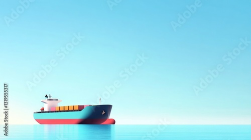 minimalist, flat, design, illustration, cargo, ship, sea, simple, geometric, shape, uniform, colours, large, open, blue, water, surrounding, vessel, emphasize, journey, ample, sky, area, up high, inviting, experiencing, immensity, potential, copy space, empty space, composition, sharpened, colours, creative, unique, minimal