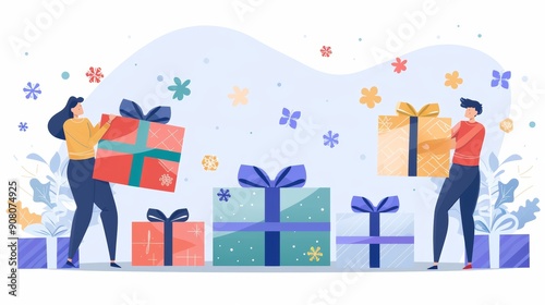 Minimalist flat illustration partners exchanging gifts with creative mail design