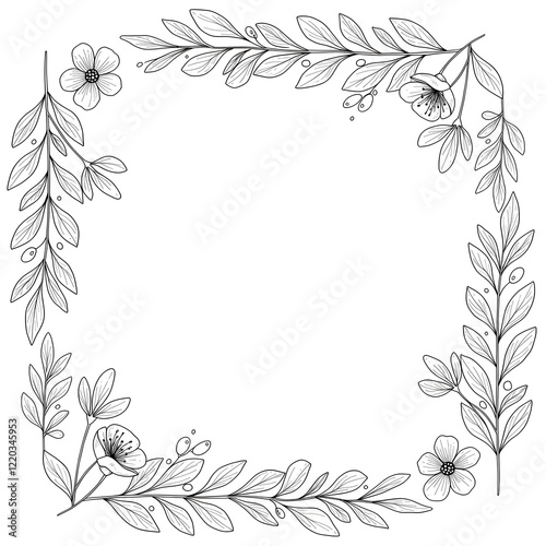 Minimalist floral frame with line-art leaves and flowers on a plain white background