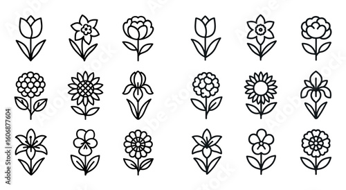 flower, garden, tulip, daffodil, peony, hydrangea, sunflower, iris, lily, violet, zinnia, outline, minimal, flat, black, clean, isolated, vector, simple