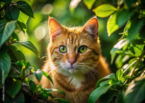 Minimalist Ginger Cat in Sunlight, Green Leaves