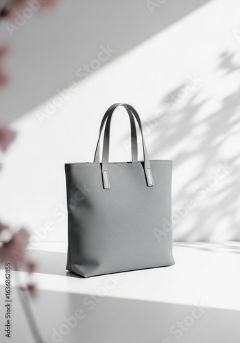 tote, bag, grey, minimalist, fashion, accessory, design, style, modern, clean, product, object, studio, shadow, light, white, surface, background, elegant, simple, chic, neutral, blank, empty, space, texture, smooth, leather, handle, detail, stitching, contemporary, lifestyle, shopping, travel, everyday, essential, carry, business, work, office, urban, casual attire, natural, floral, leaf, plant, bloom, soft