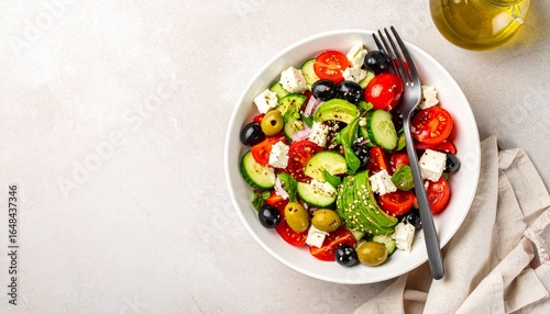 salad, greek, fresh, feta, vegetable, pure, loss, wellness, weight, health, refreshing, dressing, isolated, serving, oil, olive, calorie, fork, vibrant, taste, menu, favor, light, classic, white, space, minimalist, copy, clean, red, deliciously, healthy, lifestyle, black, tomatoes, onion, gastronomy, cucumber, greece, avocado, sliced, authentic, vitamin, portion, colourful, chopped, receipe, nourishment, green