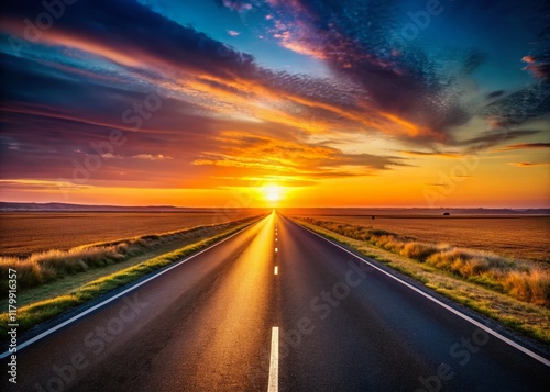 Minimalist Highway Sunset: Lone Road at Dusk, Golden Hour Landscape