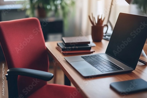 Minimalist Home Office Workspace with Laptop and Red Chair