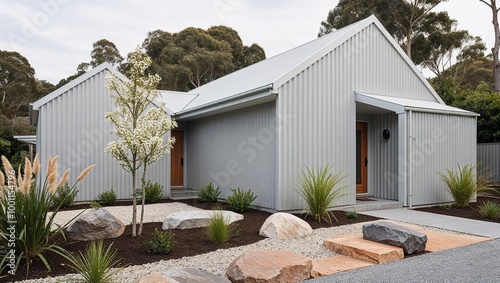 minimalist house with a corrugated metal exterior, painted in a light grey color. The structure consists of two connected sections, one with a gabled roof and the other with a flat roof.